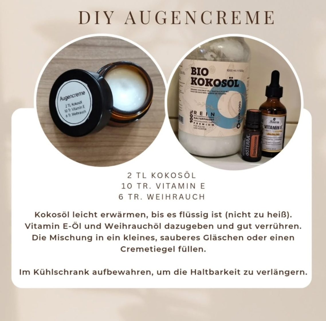 Weniger ist manchmal mehr – vor allem bei der Pflege. Diese selbstgemachte Augencreme mit Kokosöl, Vitamin E und einem Hauch Doterra-Weihrauch tut deiner Haut einfach gut. Sie versorgt die zarte Augenpartie mit Feuchtigkeit, glättet kleine Fältchen und lässt dich frischer aussehen – ganz ohne Schnickschnack.